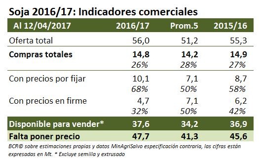 Para mediados de abril, las compras de exportación e industria suman 14,8 millones de toneladas de soja 2016/17. Si bien este volumen se encuentra en línea tanto con la originación de mercadería del ciclo anterior como del promedio de las últimas 5 campañas, apenas el 32% de esos compromisos se han hecho con precio en firme cuando el año pasado esta modalidad ascendía al 42% y el promedio de los últimos 5 años es del 50%. En el mejor de los casos (aunque es una clara sobreestimación) pueden sumarse como “mercadería con precio en firme” los 2,1 millones de toneladas que suma el interés abierto en MATba y los 2,0 millones de ROFEX, pero aun así estaríamos hablando de alrededor de un tercio de la producción.
