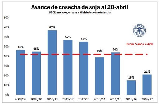 En este marco hasta el 20 de abril se había completado el 21% de la cosecha a nivel nacional. Si bien ello se encuentra por encima del 15% que se registraba hace un año atrás, dicha comparación es espuria dadas las enormes dificultades por excesos hídricos de la campaña precedente. Si tomamos el promedio de los últimos 5 años, el avance normal para esta época del año resulta del 42%, y ahí si se evidencia mejor los problemas que enfrenta hoy el sector productivo.