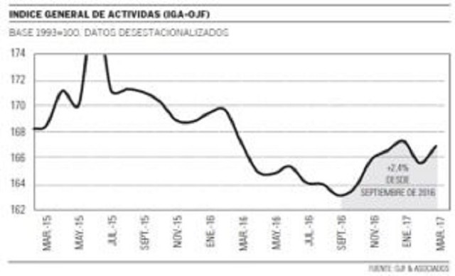 “Si bien el comienzo del año no fue particularmente favorable, en el tercer mes del año se observaron notorias reacciones en la mayoría de los sectores”, reseña OJF, y aclara que en el tercer mes del año el “modesto desempeño de la industria y el comercio (en los que se desaceleró la caída) fue compensado con un repunte en la actividad de la construcción (5,2%) y del segmento de electricidad y gas (5,2%), que acompañaron a la expansión del sector agrícola (8,1%)”.