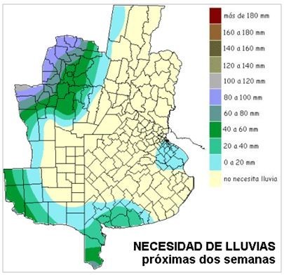 Partiendo de las condiciones actuales, podemos estimar cual es la necesidad de precipitaciones en la región pampeana para las próximas dos semanas. Esta situación queda representada en el mapa.