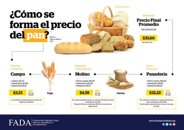 En cuanto al pan, sus eslabones alcanzan un componente de costos del 52,2% e impuestos por el 28,4%. En la cadena del pan, el trigo es el 7,8% del precio final, luego el molino con el 2,7%, la panadería el 61,1% y los impuestos trepan el 28% del precio final. Según el informe, la cadena del pan logra una ganancia del 19,4 por ciento.
