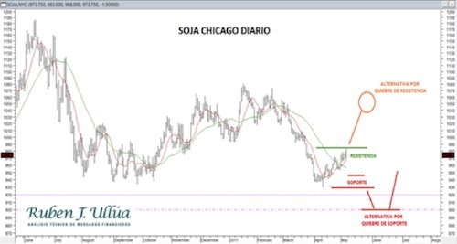 Técnicamente la principal resistencia de la recuperación de soja se centra en estas instancias alcanzadas de 970-985 centavos. Actualmente se requiere de subidas por encima de los 985 centavos para que pueda liberarse un camino de alza mayor, buscando instancias de 1020 centavos e incluso hacia los 1050 centavos; área esta última donde se concentra la resistencia de mediano plazo.
