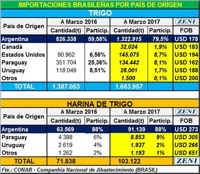 Durante los tres primeros meses de 2017 Brasil incrementó sus importaciones totales en un 20% y por 277.000 toneladas. Desde la Argentina su incremento fue de un 60% por unas 497.000 toneladas.