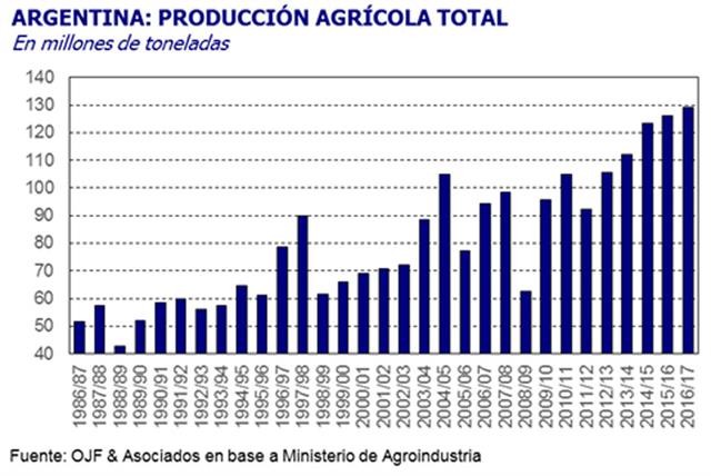 Es evidente que la tendencia de la producción es creciente, aunque con oscilaciones vinculadas a las condiciones climáticas, cambiarias y de derechos de exportación. En la actualidad, gracias a las nuevas circunstancias económicas, si bien existen condiciones climáticas adversas, se estaría alcanzando un nivel récord que hemos señalado de 130 millones de toneladas.