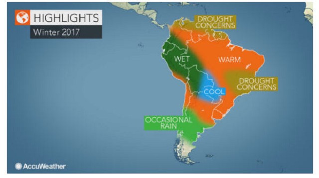 En un informe publicado ayer por el Centro Global del Clima, AccuWeather, se pronostica que la sequía podría seguir afectando a una gran parte de los países de Venezuela, Colombia y Brasil este invierno. Mientras tanto, las cálidas aguas en el océano pacífico, ayudará a difundir la lluvia en gran parte de los países occidentales de América del Sur.
