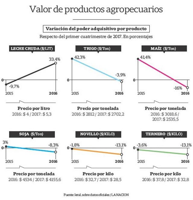 "Si comparamos contra 2016, están todos los productos peor [en poder de compra] salvo la leche cruda, que ha mejorado mucho. Si comparamos contra 2015, están claramente mejor trigo y maíz, muy parecidos soja y la hacienda, y peor la leche cruda", sintetizó el economista del Ieral.