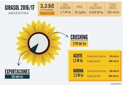 La producción argentina de aceite de girasol que surgiría de moler la cosecha 2016/2017 rondaría las 1,3 millones de toneladas. Unas 700.000 toneladas de aceite de girasol quedarían en el mercado interno argentino, utilizada por ejemplo, para aceite comestible. La exportación argentina de aceite de girasol de la campaña 2016/2017 oscilaría en las 500 mil toneladas.