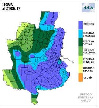 Si se consideran lotes cosechados y en barbecho, sin ningún consumo y en esta época con mínima evacuación de sobrantes de agua por evaporación, es lógico esperar un balance hídrico donde prevalezcan los excesos hídricos. El mapa da una idea donde potencialmente los suelos que pueden destinarse a la siembra, padecen excesos hídricos.