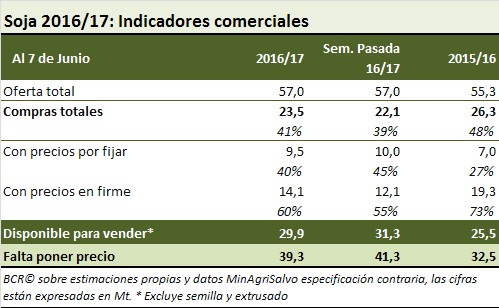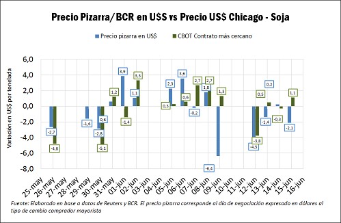 La soja en el recinto sufrió una fuerte baja en pesos (y en dólares). Desde el viernes 9 de junio al jueves 15 de junio sufrió una baja de 14,2 US$ mientras que en Chicago en el mismo período perdió 1,2 US$. El precio de la soja local se toma siguiendo los precios pizarra publicados por la Cámara Arbitral de Cereales de Rosario para cada día de negociación, expresado en dólares al tipo de cambio mayorista comprador para cada día.