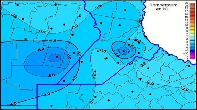 El cambio rotundo del tiempo en el fin de semana se destacó también en la zona central del país. El intenso frio dejó mínimas muy por bajo de los cero grados. La circulación del viento sur tomó fuerza durante el día domingo con ráfagas muy intensas, vigorizando el enfriamiento en la región pampeana. En la madrugada de hoy, heladas generalizadas y de variada intensidad han tomado la región. Las localidades donde se registraron las temperaturas más bajas fueron Canals con -6,5°C, Bigand con -6,1 °C y Rufino con -4,3 °C . Le siguen Maggiolo y Classon con mínimas de -3,9 °C. Los termómetros en Monte Buey y General Villegas midieron 3,4 grados bajo cero.