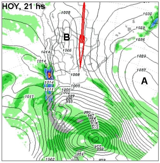 Durante el día de hoy ha comenzado a notarse un cambio de circulación. La presión en superficie comenzó a diseñar un flujo que facilitará la convergencia de aire cálido sobre la región pampeana. En el mapa de presión prevista para la noche de hoy, se perfilan una configuración de isobaras que facilitarán el transporte de aire de latitudes tropicales hacia la región pampeana. Vemos sobre el NOA, un centro de Baja presión y sobre el océano Atlántico, una zona de alta presión. Esta distribución de presión induce la circulación de aire desde el norte, la cual a gran escala se esquematiza con la flecha.