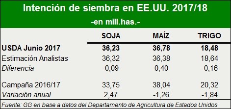 Los resultados sobre el maíz, también fueron acordes a lo esperado por el mercado. En el USDA informó que el área sembrada en Estados Unidos en la campaña 2017/18 es de 36.79 mill/has. mientras el mercado estimaba en promedio 36,38.