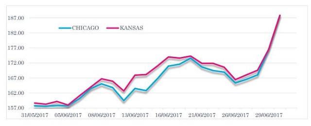 El trigo blando - en Chicago - cierra la segunda quincena de junio con subas del 12,6% para la posición julio y 9,3% para la posición diciembre. El trigo duro - Kansas - cierra la quincena con subas del 9,9% para el mes de julio y del 9% para diciembre.