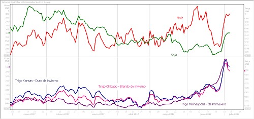 En cuanto al trigo, la variedad blanda de invierno que se negocia en CBOT subió un 8% en la semana y un 25% respecto a la misma fecha del año anterior, mientras que el trigo duro de invierno del mercado de Kansas mostró un aumento semanal del 10% y anual del 32%. El trigo de primavera de Minneapolis, en tanto, lideró las subas a largo plazo con un avance del 3% en la semana pero del 52% en el año. El siguiente cuadro muestra la evolución de estos contratos seleccionados desde comienzos del 2017.