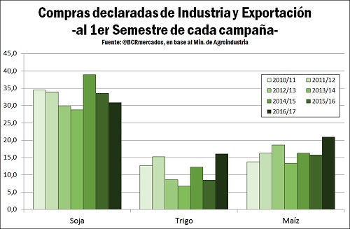 De lo anterior se desprende que mientras los negocios con trigo y maíz acumulan 16 y 21 millones de toneladas respectivamente (ello es, un 90% y un 33% más que lo negociado a la misma altura del año anterior), los casi 31 millones de toneladas compradas de poroto de soja se encuentran un 8% por debajo de la campaña previa. El principal impulsor de compras de cereales ha sido el sector exportador, que se encamina a batir todos los récords históricos de nuestro país en lo que a colocaciones externas de nuestros granos se refiere.
