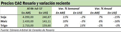 La suba externa junto con el aumento del valor de la divisa norteamericana, que tocó un máximo histórico el día miércoles con un tipo de cambio de referencia del BCRA de AR$ 17,002/US$, dieron lugar a una revalorización de los commodities agrícolas en el mercado local. El siguiente cuadro muestra los valores de referencia de la Cámara Arbitral de Cereales rosarina para los tres granos analizados junto con su variación anual en pesos y en dólares, convertidos siempre de acuerdo al tipo de cambio comprador del BNA.