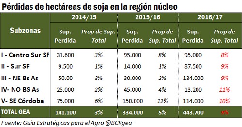 Cada año consecutivo que pasa con grandes lluvias, las pérdidas de hectareaje en la oleaginosa se multiplican. Desde hace tres años pasaron de estar típicamente entre el 1 y el 2% para subir al 3%, 5% y en el último ciclo hasta el 9%. Números contundentes que explican el creciente temor que existe en el sector agrícola ante otro año, que ya viene excedido en esta primera mitad del 2017: ya se registraron 1.000 mm en el sur santafesino y el promedio de la región supera los 700 mm.