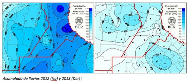 - El 2012 fue el año más fuerte de lluvias de este período de seis años que tomamos. Llovió más de 1.700 mm en muchas localidades. La media de la región estuvo entre los 1.400 y 1.500 mm. Contrastando con los valores promedios se trataron de 450 mm más en toda la región