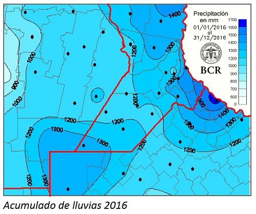 - Año 2016, la pluviometría anual mostró picos de hasta 1.700 mm. La media de la región estuvo entre los 1.200 y 1.300 mm. Contrastando con los valores promedios se trataron de 300 mm más en toda la región.