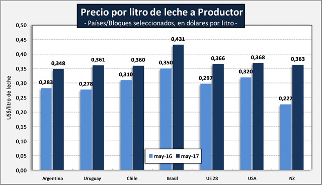 Mientras tanto, al tomarse la Unión Europea con 28 naciones allí los productores cobraron en mayo de 2017 US$ 0,366. En tanto, en Nueva Zelanda, país donde la leche aporta el 25% de las exportaciones totales, el valor de mayo de este año se ubicó en US$ 0,363.