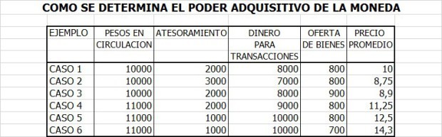 En el cuadro 1 pueden verse diferentes ejemplos en los que se determina el poder adquisitivo de la moneda. Por ejemplo, tomemos el caso 1. Hay 10.000 en circulación, la gente tiene 2.000 de demanda de moneda o atesoramiento por las dudas, por lo tanto lo que utiliza realmente para transacciones son 8.000. Supongamos que se producen 800 unidades, entonces el precio promedio de todos los bienes de la economía será 10. Vayamos ahora directamente al caso 5 del cuadro y supongamos que el Banco Central expande la cantidad de moneda un 10% pasando de 10.000 a 11.000 el stock de pesos en circulación y que al mismo tiempo baja el atesoramiento de moneda de 2.000 a 1.000. Si la cantidad de bienes se mantiene constante en 800 unidades, el precio promedio de todos los bienes de la economía será de 12,5. En otras palabras, el Banco Central puede haber aumentado el circulante un 10% pero el precio promedio de los bienes de la economía haberse incrementado un 25% porque una parte del aumento de precios se debe a la caída en la demanda de moneda y por otra parte se debe a la mayor cantidad de pesos en circulación frente a una misma cantidad de bienes.