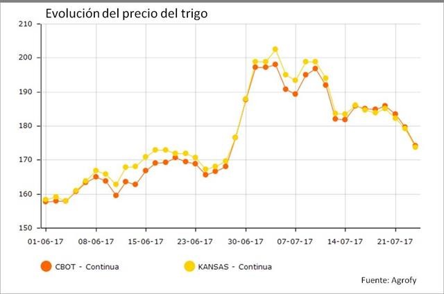 Como resultado de todo esto, en nueve de las últimas diez ruedas el trigo se negoció con resultado negativo en las dos principales Bolsas estadounidenses. En efecto, entre el cierre alcista del martes 11 y ayer, la posición septiembre del cereal cayó un 14,28% en Chicago, tras pasar de 203,19 a 174,17 dólares, y un 15,20% en Kansas, de 204,85 a 173,71 dólares por tonelada.