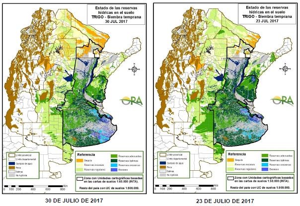 La mayor parte de las localidades de seguimiento con probabilidad de volver a la situación de excesos generalizados en lotes con (o preparados para) trigo se hallan en el este y sur de la provincia de Buenos Aires. Si bien el modelo empleado indica que esto sólo sucedería con lluvias abundantes, debe tenerse en cuenta que un acumulado de 20mm en una semana puede clasificarse como abundante en los meses de invierno.