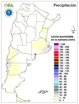No se registraron precipitaciones en NEA, NOA y Cuyo. En la región pampeana sólo hubo registros al este, superándose los 10mm acumulados en la semana en la cuenca baja del Salado bonaerense y sudeste de la provincia de Buenos Aires. El máximo acumulado, según datos oficiales disponibles, corresponde a 25,3mm en Dolores.