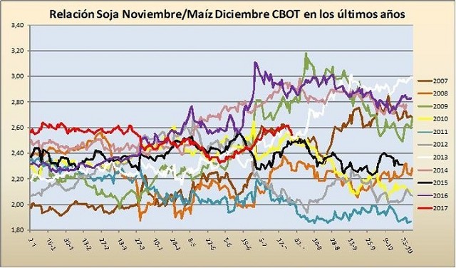 En términos estacionales para comienzos de agosto este ratio se encuentra entre los mayores niveles en más de una década, aunque lejos de lo vislumbrado a esta altura de 2016 cuando trepó a prácticamente 2.90 (línea violeta). Recordemos que cuando esta relación excede 2.40 se supone que para un productor norteamericano del Medio Oeste resulta más rentable producir soja, de lo que se desprende que mirando en forma simultánea la estructura de oferta y demanda de ambos cultivos este último producto sigue generando mayor interés (aunque en menor medida si lo contrastamos con lo observado hace doce meses).