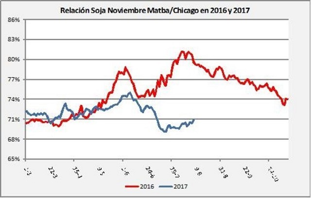 No obstante esto último la comparación interanual refleja que estamos más de 10 puntos por debajo de la campaña pasada, por lo que no hay que descartar que la plaza doméstica gane terreno contra EEUU en el mediano plazo, y a partir de esto la soja en nuestro país se fortalezca.