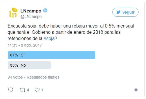Sin embargo, de acuerdo a una encuesta realizada por LN Campo, que durante ocho horas reunió 94 votos, la disminución debería ser más importante. En rigor, un 67% respondió que debe haber una baja mayor en las retenciones a la soja contra un 33% que no lo consideró necesario.