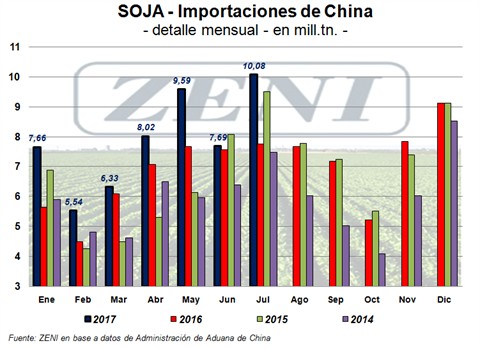 Un informe de Zeni señaló que las importaciones totales de soja por parte de China alcanzaron un nuevo récord, con 10,08 millones de toneladas en julio pasado. Según informó la empresa en base a datos oficiales de China, el máximo anterior se había alcanzado en mayo de este año, con 9,59 millones de toneladas.