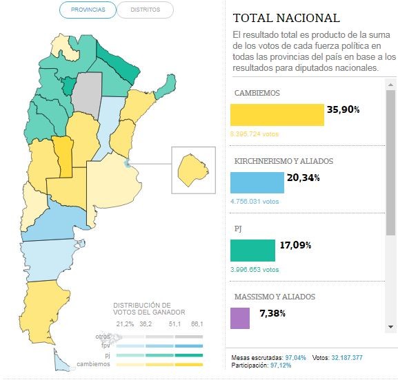 Para diputados nacionales, en la provincia de Córdoba, en Marcos Juárez, otra de las zonas clave de la región, Cambiemos se impuso con un 47,75% contra un 32,85% de Unión por Córdoba, el espacio que impulsa el gobernador Juan Schiaretti. De igual modo, Cambiemos ganaba en Río Cuarto.