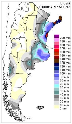 En el oeste entrerriano el sur de SF y gran parte de BA, la carga pluvial normal del mes de agosto no supera los 40 milímetros. Algunas marcas ya suman casi el doble de este valore estadístico. Se destaca el máximo en el noreste entrerriano, la zona de influencia de la ciudad de Concordia, donde las precipitaciones ya han superado los 200 milímetros, tres veces la marca normal del mes de agosto y record para la primera quincena desde 1949. Este máximo del noreste de ER, se proyecta a gran parte del territorio uruguayo, con lo cual el país vecino termina incorporándose a una zona muy vasta donde los excesos hídricos ya condicionan el desarrollo del mes de agosto.
