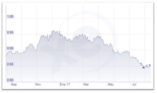El gráfico es elocuente. A principios de año, con un solo euro se compraba casi un dólar. Hoy se necesita 0,84 euros para comprar un dólar.