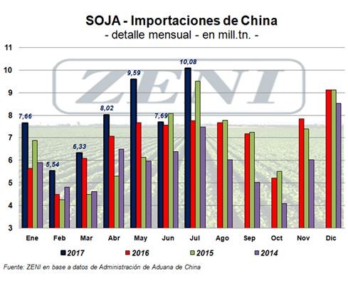 El 8 de agosto pasado, con datos de la Aduana de China, Zeni informó que las importaciones totales de soja lograron un nuevo récord, con 10,08 millones de toneladas en julio pasado.