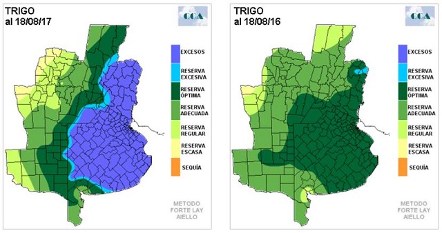 Para esta fecha algunas zonas del centro norte de Río IV parecen acusar un mayor ajuste de humedad. La provincia de CB debería tener una buena evolución de las sementeras de trigo si la primera quincena de septiembre trae algunas precipitaciones, no necesariamente abundantes, lo suficiente como para recomponer o mantener el patrón adecuado. De mantenerse la oferta de agua escasa, pasando esa fecha, la demanda le pasará factura a las reservas y el cultivo no encontrará un contexto favorable para ingresar a la floración. De nuevo es difícil esperar que esto suceda en áreas del este.