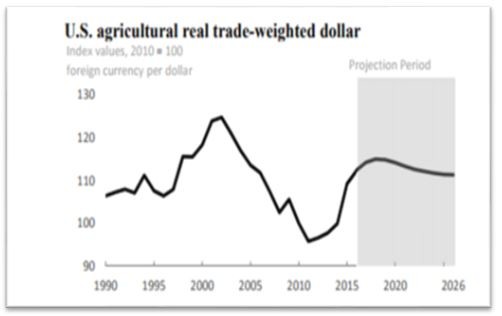 El mismo USDA, en sus recientes proyecciones hasta el año 2026, estima una suave depreciación del dólar hasta ese año.