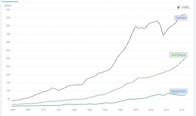Si comparamos las exportaciones argentinas con las de otros países como Australia y Canadá, veremos que ellos crecieron en dólares constantes gracias a su incorporación al mundo y nosotros nos quedamos estancados en dólares constantes.