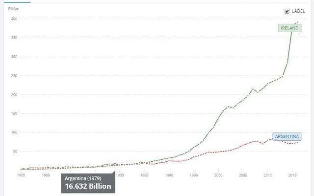 Además, en la década del 90 se inició una fuerte baja de impuestos para atraer inversiones. Hoy día el impuesto a las ganancias a las corporaciones es del 12,5%. A todo esto recordemos que Irlanda tiene un territorio algo menor al de la provincia de Entre Ríos pero su capacidad de exportar es sustancialmente mayor a la nuestra. Hoy día exporta U$S 154.000 millones versus los U$S 57.700 millones que exportó Argentina en 2016.