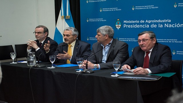 Ricardo Buryaile, junto con Amadeo Nicora, autoridades del Ministerio de Ciencia, Tecnología e Innovación Productiva y de Laboratorios INMUNER S.A. en la presentación de la primer vacuna biológica desarrollada en el país contra la enfermedad de Gumboro