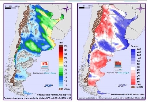 Para la semana del 12 al 19 de septiembre, se esperan precipitaciones de variada intensidad en áreas de la región Pampeana (sudeste y centro), NEA (norte), Chaqueña (este) y Patagonia (oeste y extremo sur). Los mayores acumulados se darían en Misiones y Corrientes. Por el momento, sin lluvias en las restantes áreas del país.