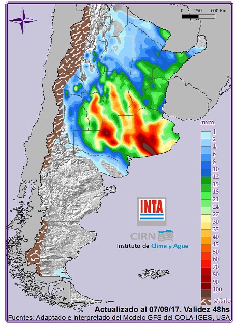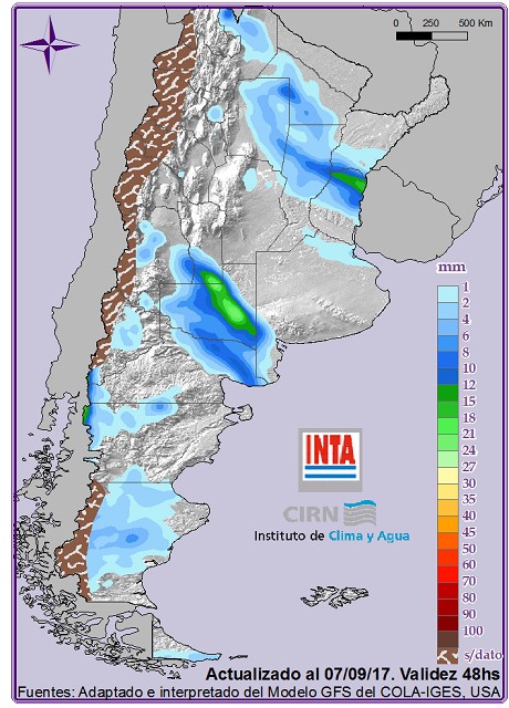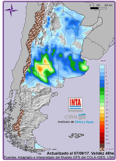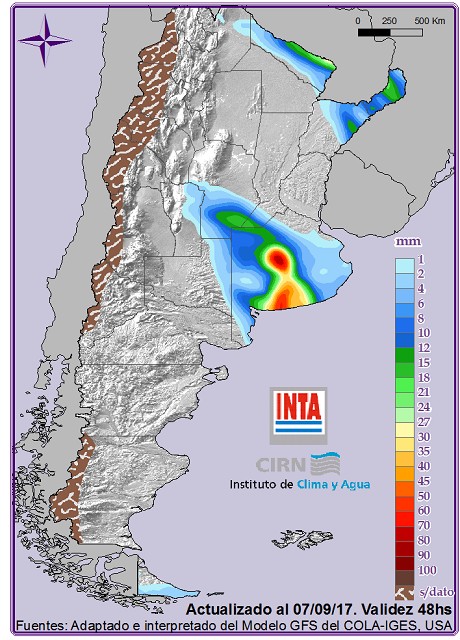 Sobre la porción centro se prevé un sistema de mal tiempo que generaría tiempo nuboso, vientos del norte que rotarán al sur, probabilidad de lluvias y algunas tormentas aisladas, especialmente sobre el sur de Mendoza, La Pampa, sur de San Luis y este y centro de Bs. As.