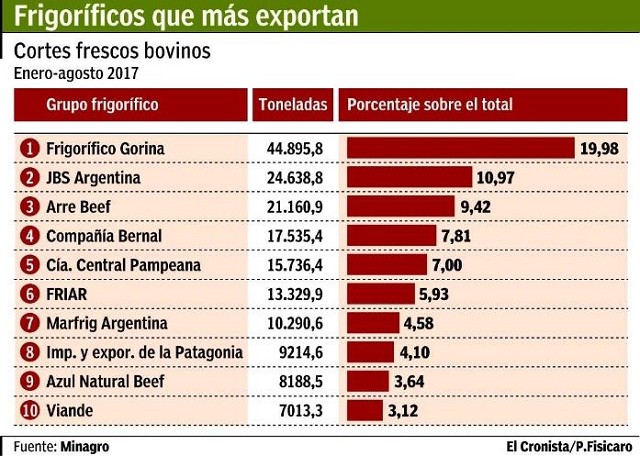 Los responsables de tal situación son una veintena de frigoríficos exportadores, que entre todos colocaron en el exterior una 224.654 toneladas de cortes bovinos frescos, entre congelados, enfriados y Cuota Hilton (destinada al cupo establecido por la Unión Europea), entre los meses de enero y agosto de este año. Los datos del Ministerio de Agroindustria de la Nación permiten destacar que apenas cinco grupos empresarios concentran el 55% de las exportaciones argentinas de cortes frescos bovinos. Tal como publicó el sitio Valor Carne, se trata de las familias locales Riusech, Borrell y Braun, junto con la brasileña JBS y la china Compañía Central Pampeana.