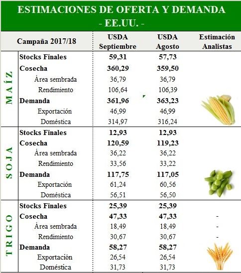 Por el lado de los stocks finales para EE.UU, para el ciclo 2017/1018 se incrementa a 59.3 mill/tn. Los analistas en promedio esperaban una reducción hacia las 55,12 mill/tn. En el mes de agosto los stocks finales eran de 57.74 mill/tn.