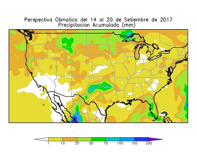 Al comienzo de la perspectiva, el ultimo remante de la Tormenta Tropical Irma provocando precipitaciones abundantes en el norte del área triguera, el noroeste del cinturón maicero y el extremo sur de la Región Sudeste, mientras que la mayor parte del resto del área agrícola norteamericana recibirá precipitaciones escasas. Se prevé que el huracán José se mantendrá en el Atlántico occidental durante la próxima semana, sin afectar al territorio norteamericano. Posteriormente, una vigorosa irrupción de aire polar hará descender las temperaturas mínimas por debajo de lo normal para la época. Hacia el final de la perspectiva, los vientos rotarán al sector sur, causando temperaturas máximas elevadas en la mayor parte del área agrícola norteamericana. Este proceso será acompañado por fenómenos extemporáneos que afectarán a gran parte del área agrícola norteamericana: Fuerte lluvia para el norte de las Rocallosas y las altas planicies del norte.14-15 de Septiembre; Temperaturas muy inferiores a las normales para las montañas septentrionales de las Rocosas y las altas planicies septentrionales, 14-17 de Septiembre; Olas significativas que se desplazan hacia el norte desde las Carolinas hasta la mitad del Atlántico.16-18 de Septiembre; Olas significativas desde el centro del Atlántico norte hasta Nueva Inglaterra. 19-20 de Septiembre; Inundaciones inminentes en el sureste de Texas, península de la Florida, Georgia y los Apalaches del sur.