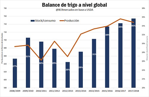 Finalmente a nivel global, la producción de trigo 2017/18 quiebra la tendencia alcista de las últimas 5 campañas para caer 8,5 Mt y ubicarse en 745 millones de toneladas. Pese a ello, las existencias mundiales iniciales siguen siendo formidables y elevan la relación stock final/consumo a un record de 36%.