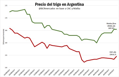 En tanto, en el recinto local el trigo 2016/17 entró en letargo desde el comienzo de este mes y se estabilizó en un valor de compra disponible de $ 2.600/t, con 50 pesos más de mejora bajo la condición contractual. Sin embargo, esta semana reaparecieron los premios por calidad, los forwards para la nueva cosecha y se sumaron más compradores activos. Las entregas en enero y febrero del 2018 fluctúan de u$s 160 a 163 por tonelada. Por su parte, en el mercado de futuros de Buenos Aires, el trigo tocó un piso de 160 dólares el 5 de septiembre y desde entonces tomó la senda alcista hasta los u$s 165,5/t.