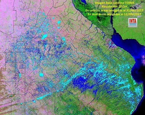 Hay imágenes que dicen más que mil palabras. La siguiente foto satelital realizada por el INTA muestra claramente las hectáreas anegadas al 31/8 en color celeste que se suman a las recientes inundaciones del pasado fin de semana (azul).