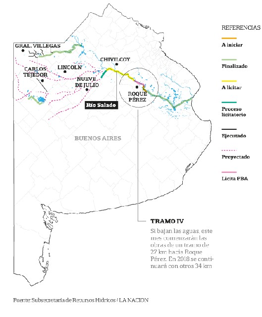 En cuanto a las obras del Salado, se está iniciando a fin de mes el primer tramo de la IV etapa, cuya inversión es de $ 1600 millones, con el aporte del gobierno nacional. También se va a licitar a principios de noviembre la etapa 1B, con financiamiento del Banco Mundial por US$ 300 millones, que empezará a principios del año próximo. La cuarta etapa en su conjunto tiene un valor total de US$ 1100 millones.